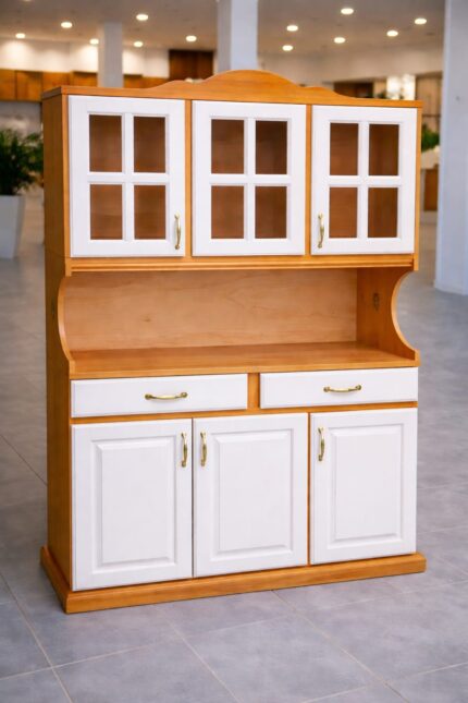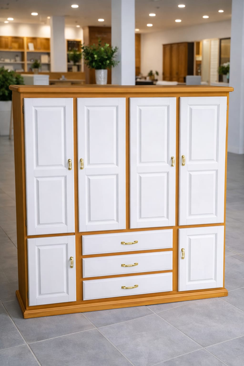 Hermoso Modular Capilla fabricado en pino macizo, teñido en tono miel y pintado en blanco, combinando calidez, elegancia y resistencia.
